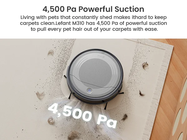 Living with pets that constantly shed makes ithardto keep carpets clean.Lefant M310 has 4.500 Pa ofpowerful suction to pull every pet hair out of yourcarpets with ease.