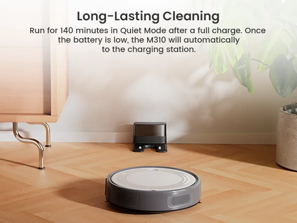 Run for 140 minutes in Quiet Mode after a full charge.once the battery is low, the M310 willautomatically to the charging station.