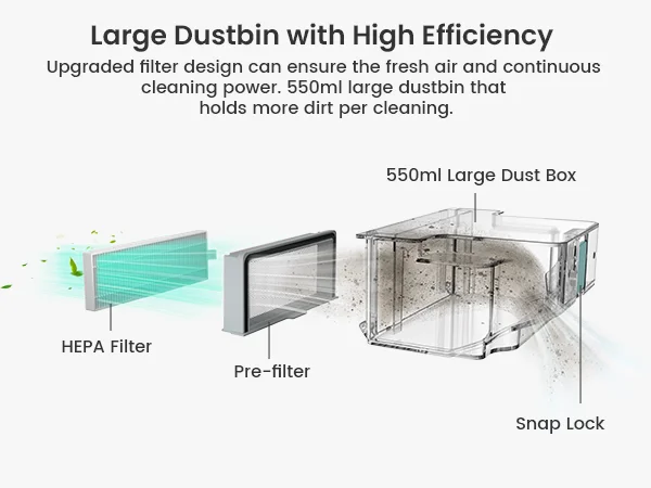 Upgraded fiter design can ensure the fresh air and continuous cleaning power. 550ml large dustbin that holds more dirt per cleaning
