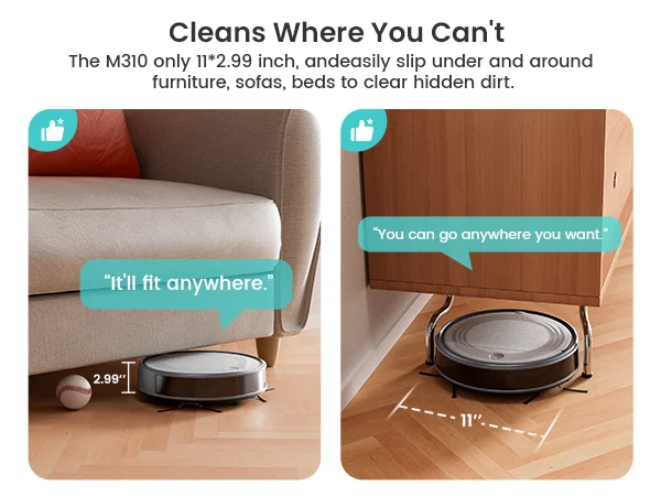 The M310 only 11*2.99 inch, andeasily slip underand around furniture, sofas, beds to clearhidden dirt.