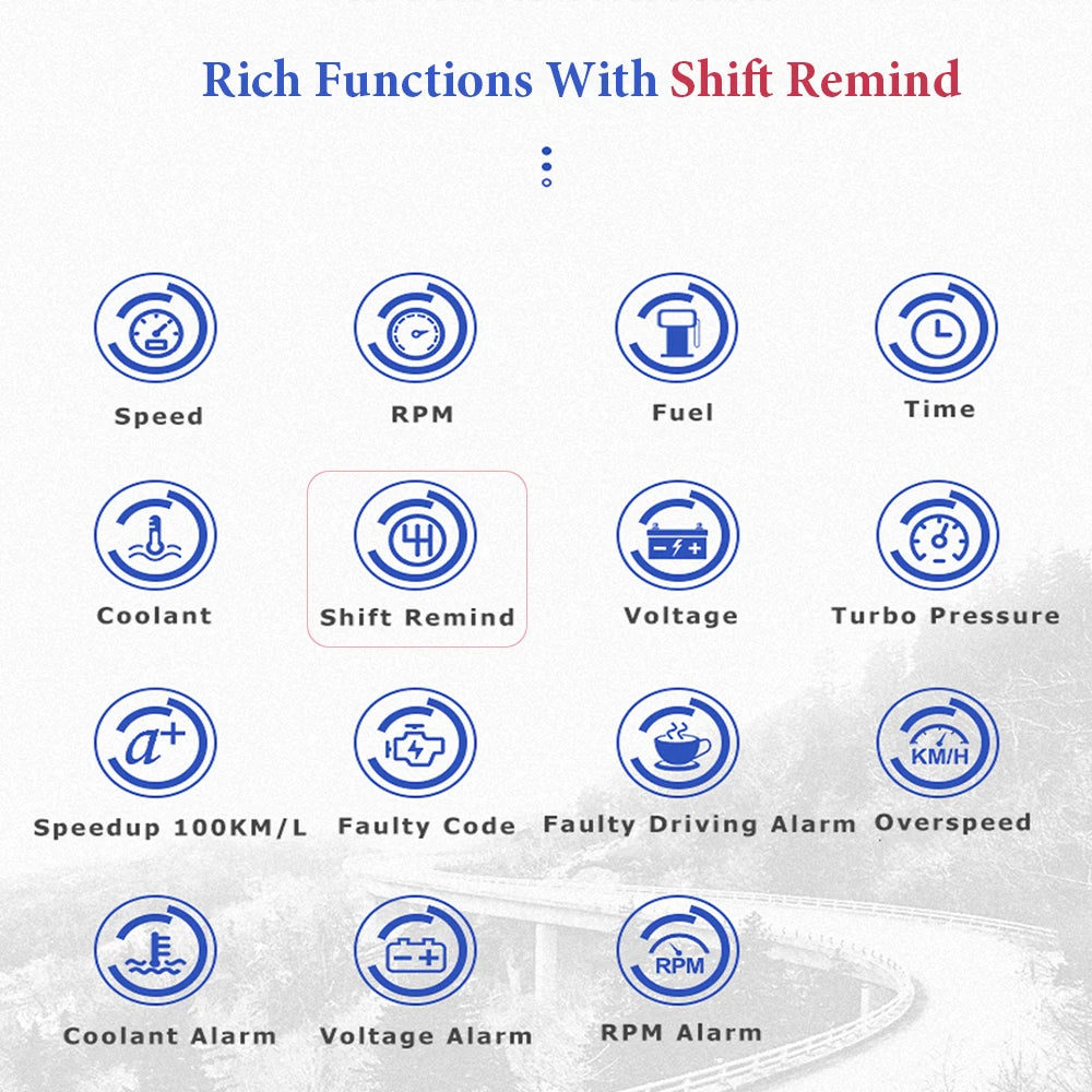 Alarms: overspeed alarm, High water temperature alarm, Low voltage alarm, Shift Reminder, Engine fault alarm, Clear fault code, Free switching between kilometer and miles, KM/h & MPH Switch freely, °C & ℉ switch freely, Fatigue driving reminder...