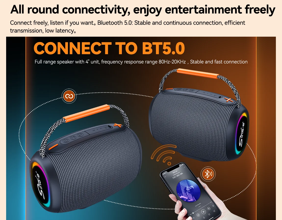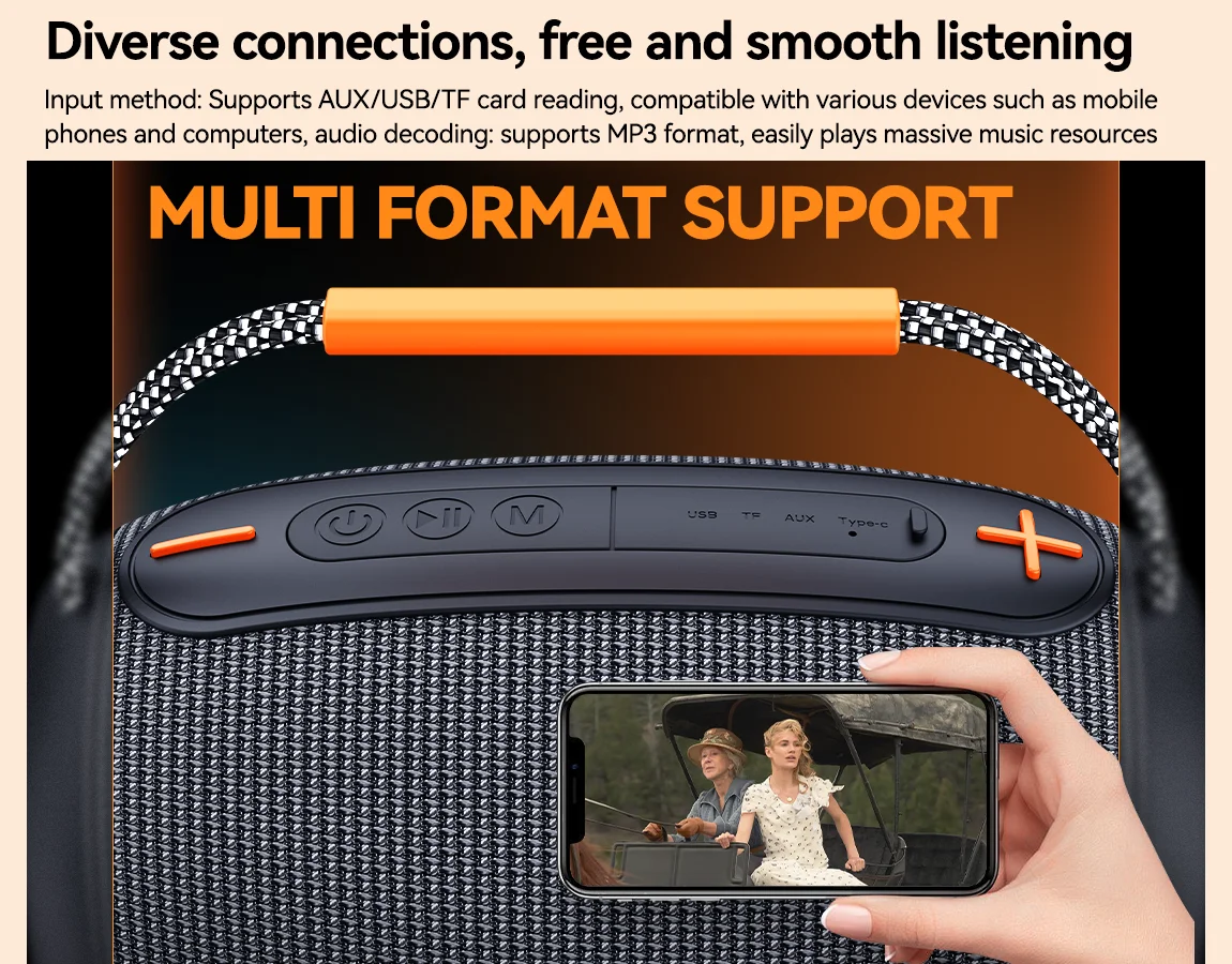 Bluetooth 5.0 stable connection, supports multiple inputs such as AUX/USB/TF card, seamless connection between mobile phone, computer, and microphone, MP3 decoding for smooth listening to massive music library